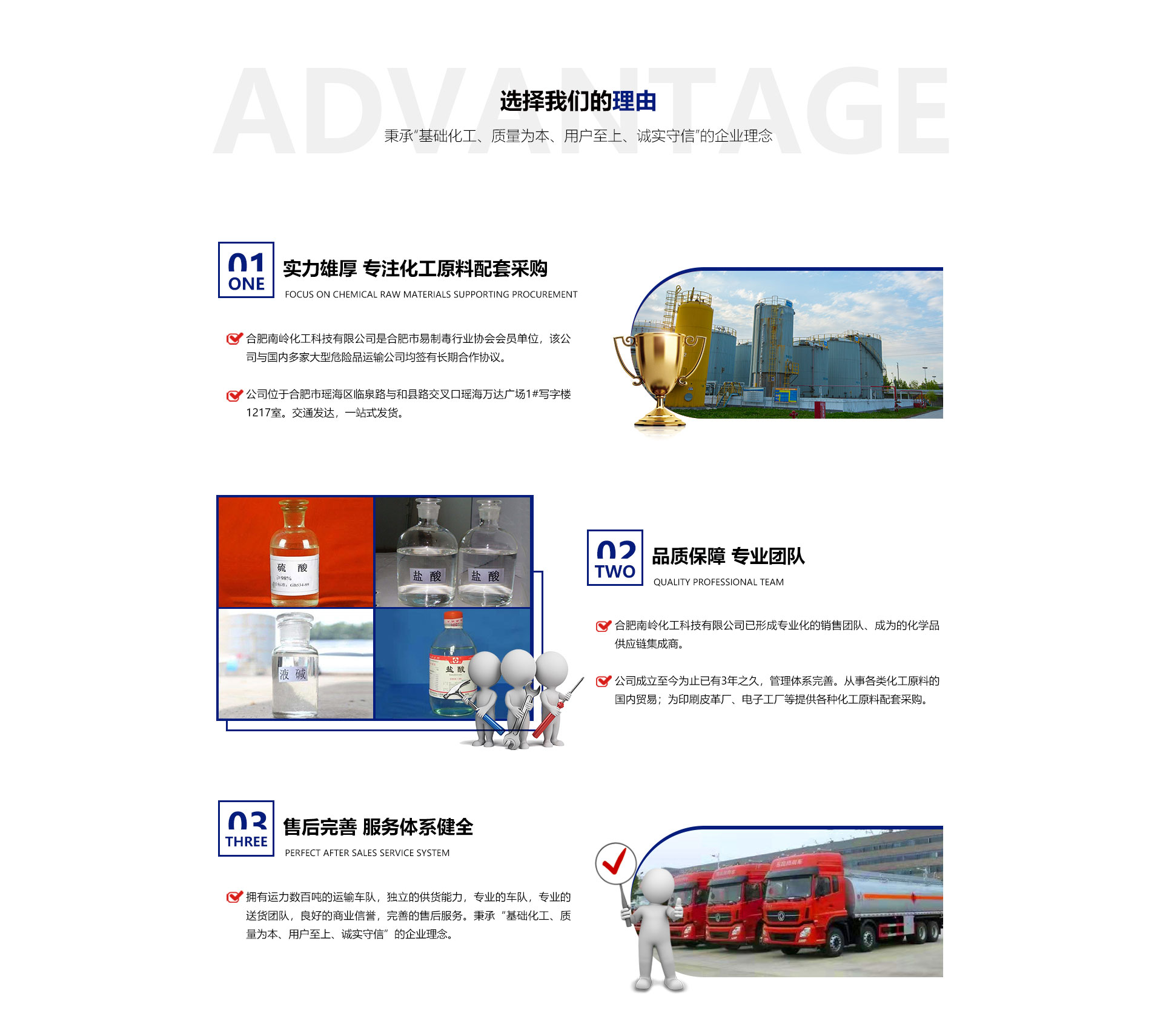 合肥南嶺化工科技有限公司是合肥市易制毒行業協會會員單位,該公司與國內多家大型危險品運輸公司均簽有長期合作協議,擁有運力數百噸的運輸車隊,獨立的供貨能力,良好的車隊運輸,有效的送貨團隊,良好的商業信譽,完善的售后服務。秉承“基礎化工、質量為本、用戶至上、誠實守信”的企業理念。從事各類化工原料的國內貿易;為各個化工廠、印刷皮革廠、電子工廠等提供各種化工原料配套采購。目前,公司正朝著以貿易為基礎、以實業為依托,采購、銷售,內外貿一體化,上下游一體化,具有綜合增值能力和復合競爭能力化工原料供應商。本公司主要經營的產品有:鹽酸、硫酸、液堿、片堿等。合肥南嶺化工科技有限公司已形成服務,售后一體化的團隊、成為的化學品供應鏈集成商。為客戶提供良好的服務及產品,本公司經銷的各種產品不僅在安徽地區深受用戶好評,而且具有很高的市場占有率,產品行銷各個地區。